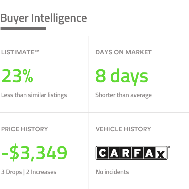 Know how long a car's been for sale, how its price compares to similar vehicles, if its price drops (or rises), and its Carfax report.